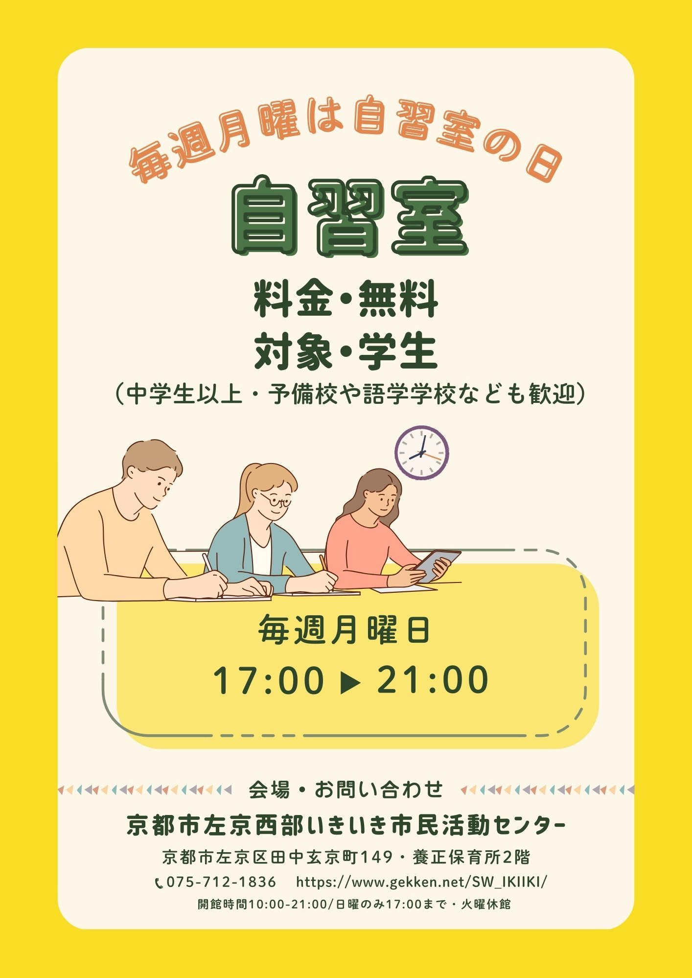 毎週月曜にセンターの空室を「自習室」として開放しています。