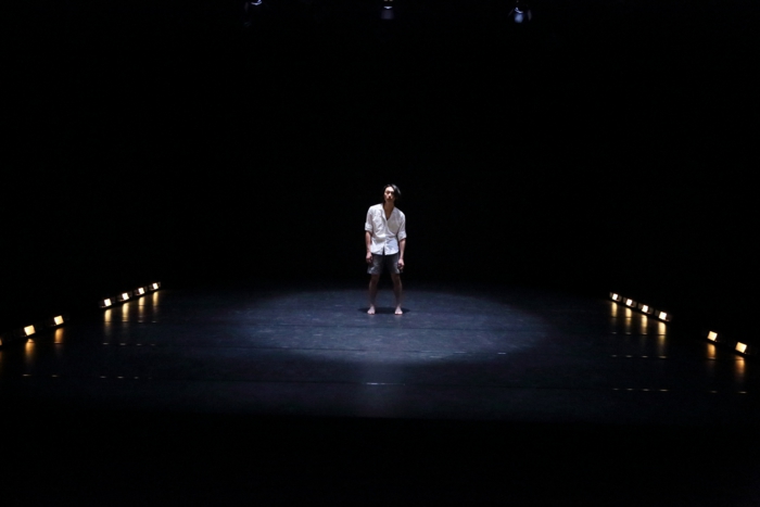 その後、獣のように発声しながら、四つ足で舞台上をゆっくりと横切ると、立ち上がって雨の効果音の中でしばらく佇み舞台上から立ち去っていった。