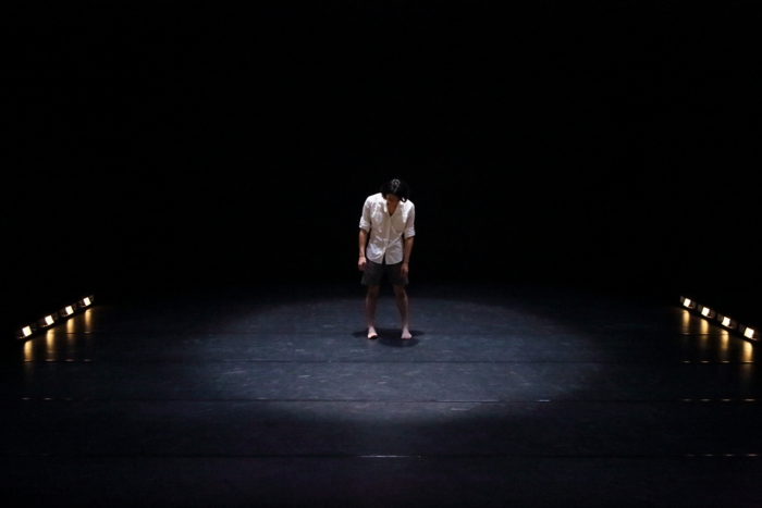 時々、肩をまわしたり上を向いたりする動作を起点にして、身体のエネルギーの経路を探るような一連の動作を繰り返す。そしてある時点(概ね、両手と頭頂部を床につける姿勢)でふっと素に戻り、舞台上を一通り歩きまわる。そしてまた何かを探索する、の繰り返しが続くのだが、醸し出す雰囲気は不思議と爽やかである。