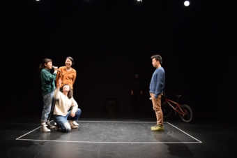 帽子を目深に被った中国出身の女性。唯一ループする事が全くない女性で(おそらく舞台上での場所、行動などが、繰り返しを避けるために念入りに演出されている。)舞台上を所在無げに、ブラブラしたり、自転車に乗って走り回ったりしているが、中盤で一人語りが始まる。なんだか重い内容だが、内容はリアルでもフェイクでもどちらでも良い。それより話の途中に身体にだんだんと力が入っていくのだが、その力の入れようのコントロールの過程が見えるのが、今回の作品の一つの見せ場だと思った。そして語り終えると、ふっと退場してもう舞台に出てこないところも見事だった。