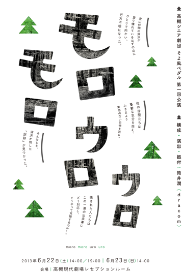 ある公演の前、偶然、その劇団員の方をJR高槻と阪急の間でお見かけしたんです。遠目で、ご本人と分かったのですが、近づくにつれ、少し挙動がおかしいと気づきました。その挙動とは、片手に台本のコピーをくちゃっと握りしめ、台詞を返しながらのショッピングでした。ああ、なんてけなげなんだろうと関心したのですが、それとは別に「私の書いた台詞で・・・」という罪悪感が私に強く押し寄せて来たのです。私の書いた台詞なんて、そんな一心不乱に憶えるに値する言葉なのだろうか? もう少し記憶に留めるなら、高尚で学知術的に価値のある言葉がいいんじゃないか? と、元も子もないようなことを考えるようになったのです。