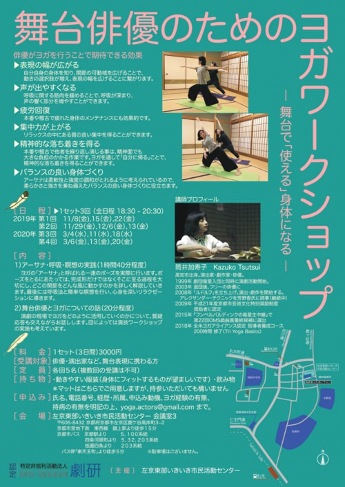 左京東部いきいき市民活動センターでは、『舞台で「使える」身体になる』ということで、「舞台俳優のためのヨガワークショップ」を開催します。講師には京都の小劇場で演出・劇作・俳優をされている「ルドルフ」の筒井加寿子さんをお招きします。筒井さんは体のことを見つめる中でヨガに辿りつき、昨年、全米ヨガアライアンス認定の指導者養成コースも修了されました。先日、大阪での実施をされていたのが、今回は京都開催です!是非この機会をお見逃しなく!