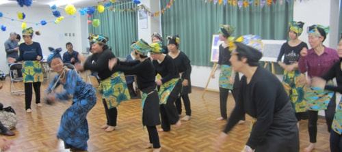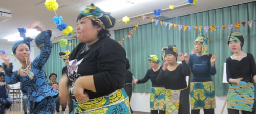 午後2時から集会室を会場に始まったパフォーマンスは、支援施設なづな学園でアフリカンダンスに取り組むメンバーと、その指導者「フージーズ」によるアフリカンダンスで盛り上がりました。激しい太鼓のリズムに合わせて、本当に楽しそうに皆さんが踊る姿が印象的でした。