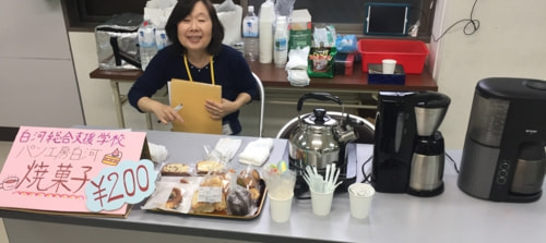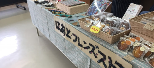 カフェコーナーとアートグッズなどの販売は午後1時から始まりました。障がいを持つ方が京都市内の作業場で作った商品や、白河総合支援学校の生徒さんが作った焼き菓子などが並べられ、センターの利用者さんや、地元の方、催しに来られた方々が商品を見たりお茶を飲んだり、普段のセンターとは少しちがうしつらえを楽しんでいました。
