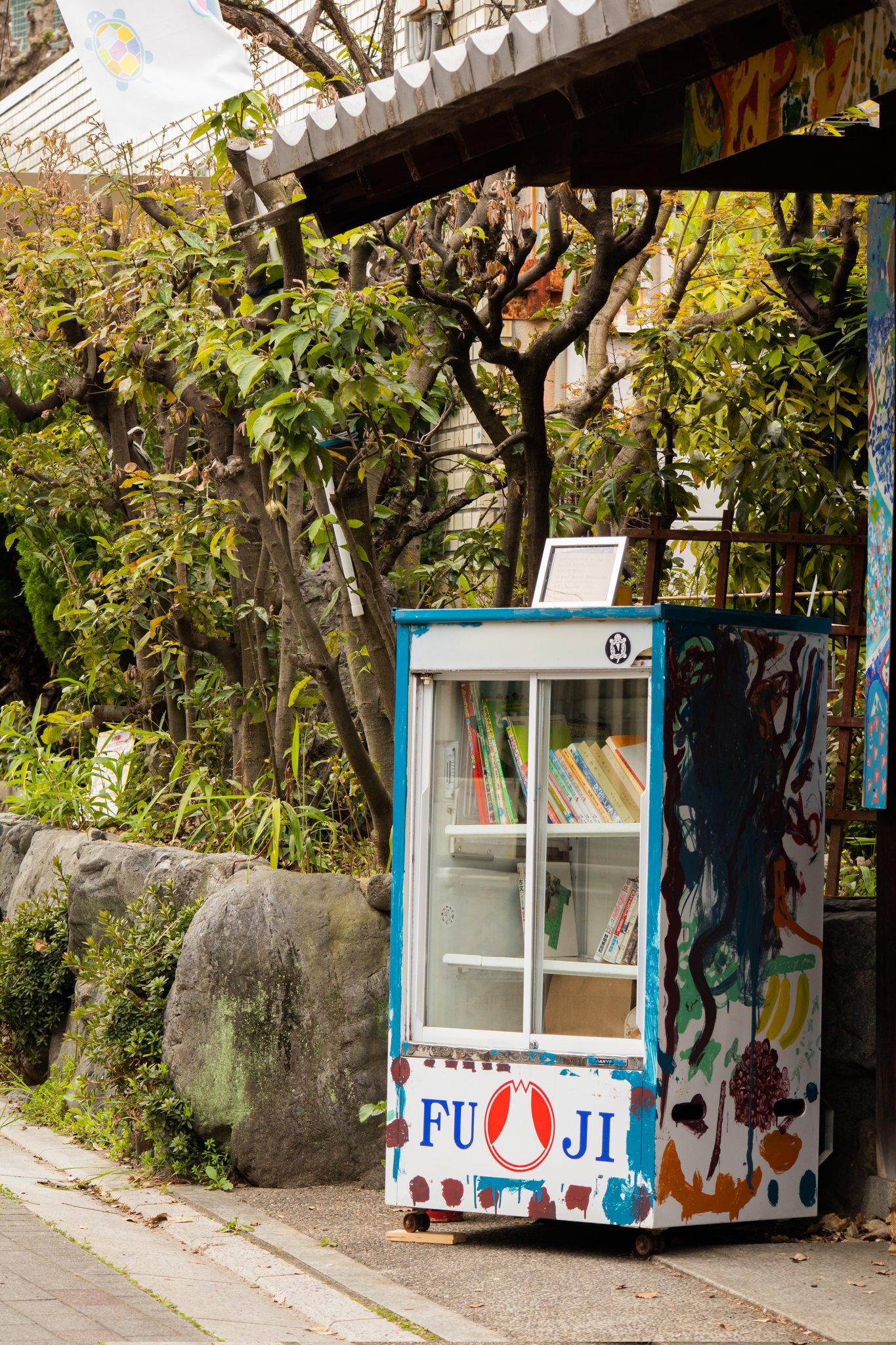 ふれあいサロン前の歩道沿いに「パブリック本棚」を置きました。近くの銭湯「銀座湯」さんから頂いた冷蔵庫を、昨年の「かもがわデルタフェスティバル」で遊びに来た子どもたちに絵を描いてもらい、本棚として再利用しています。
