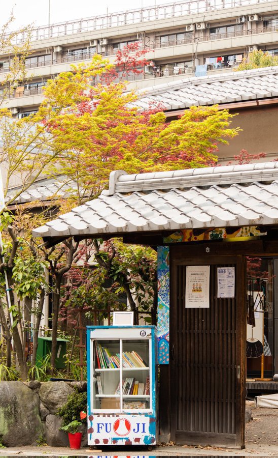 ふれあいサロン前の歩道沿いに「パブリック本棚」を置きました。近くの銭湯「銀座湯」さんから頂いた冷蔵庫を、昨年の「かもがわデルタフェスティバル」で遊びに来た子どもたちに絵を描いてもらい、本棚として再利用しています。