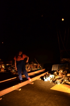ところが、まったく逆説的だが、この完結した世界は、我々の現実が3.11‘以後’にあることを喚起してやまないのである。あろうことか作品中には「大洪水、大震災、大火災」と連呼する場面や、「皆さん逃げて下さい!」という台詞があって、見る側はどうあっても4年前の東日本大震災と津波を思わずにはいられない。大量のガラクタは被災地の瓦礫を連想させもするだろう。作品は3.11より以前の作で、もとより震災に言及したものではない。件の場面や台詞は、乱調をきたす世界がダンスの衝動を呼び起こすことを狙った、山下一流の言葉による振付の本髄でもある。その狙いは今回の上演から十分に受け取ることが出来た。しかし同時に、それが意味するものを、観客は振付家の意図を越えて受け取ってしまう。震災は起こったのであり、我々の現在は3.11という経験を前提としており、それ以前に戻って何かを思考することは出来ないところに来ている。本作の良心、素朴さ、ダンスの到来を待つ普遍的な時間が、反語的に3.11以後という歴史上の時間を浮上させる。