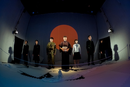 テクスト・リーディングのコラージュに終始するかと思いきや、能面をつけた女優が客席と舞台を隔てていたロープを取り外すと、朗読した三人の男優と五人の女優が客席に進み出て観客に立ち混じって坐し、その場でそれぞれに声をあげる。彼らはそれぞれの立場から、「〇〇のために平和を守れ」というシュプレヒコールを発する。そして最後には、俳優全員が同時に「平和を守れ」と発声する。この場面は圧巻である。もちろん、調和のとれたユニゾンではない。耳に響くこの不協和音は、平和を守るために戦争するという立場や、平和を守るために声をあげる、あるいは沈黙する立場など、いろいろな人々のさまざまな思いが非戦へと、平和の実現へと収斂することのむずかしさを感じさせる。