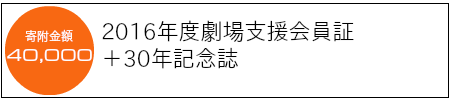 チケットレスとなります。ご予約観劇日の当日受付窓口へお申し出ください。 30年記念誌 無門館時代からアトリエ劇研までの30年の歩みを1冊にした書籍をお申し込み後住所へ郵送させていただきます。(定価2160円)劇場支援会員証 会員証のご提示で2016年4月1日から2017年4月2日までの1年間アトリエ劇研全公演が1演目につき1回観劇いただけます。※連携劇場の観劇は含みません。 税控除について フォームにご入力いただいたお名前ご住所で、寄附金受領証明書を発行いたします。税控除についてはこちらをご参照ください。 |